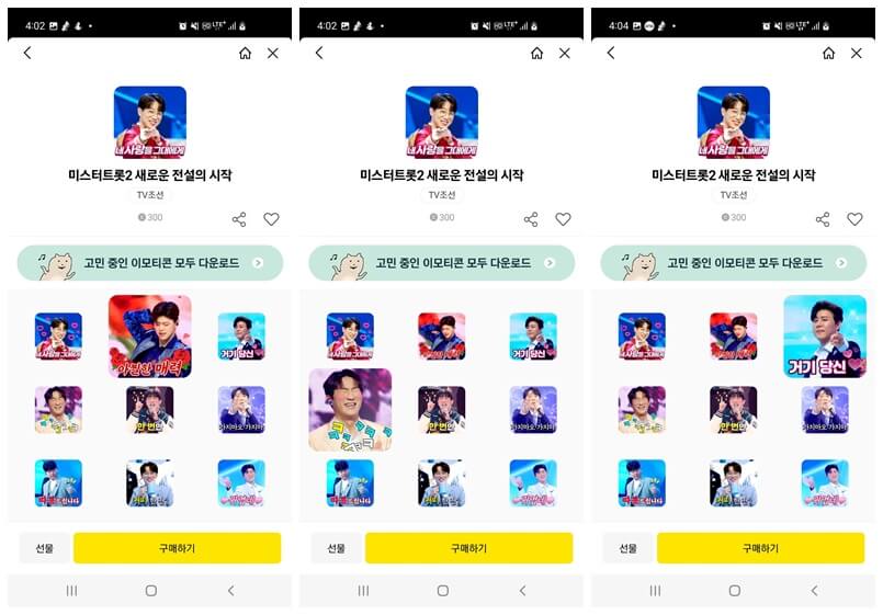 미스터트롯2 새로운 전설의 시작 이모티콘을 클릭해서 어떤 이모티콘들이 있는지 살펴봅니다. 출연진들 영상을 아주 적절하게 활용해 귀엽게 출시되었답니다.