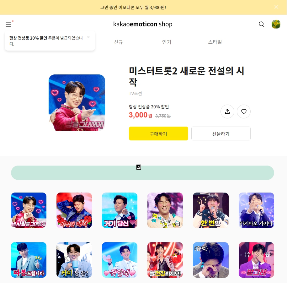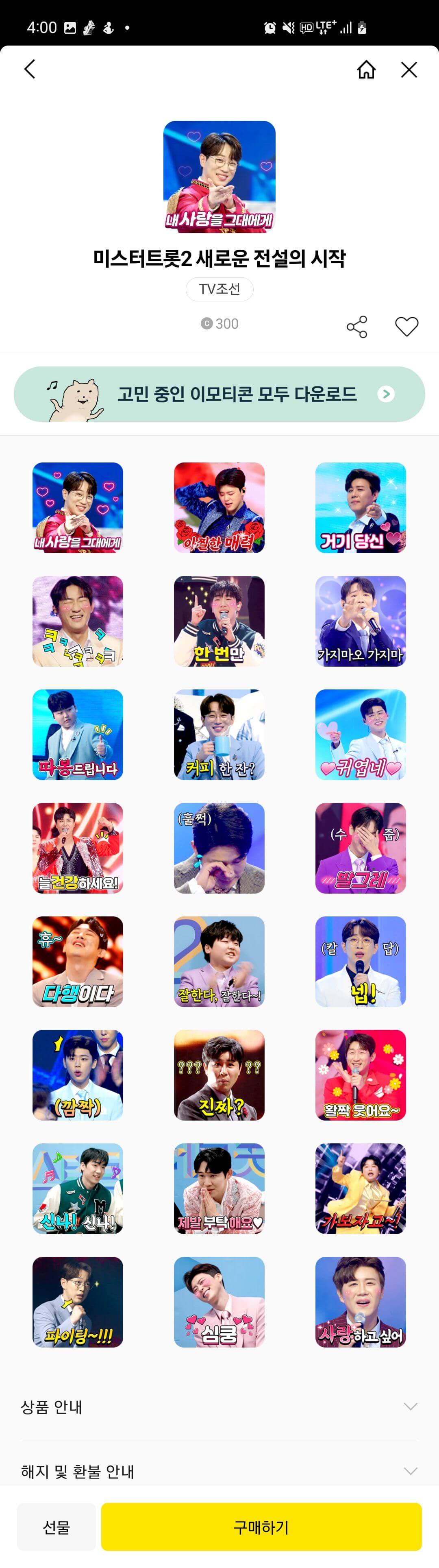 휴대폰 카톡 앱으로 접속하면 이모티콘을 더 빨리 구매할 수도 있는데요. 미스터트롯2 새로운 전설의 시작 이모티콘 전체 모습 한 번 살펴보세요~~^^