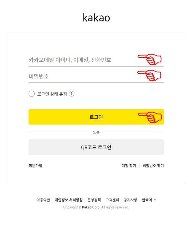 오른쪽 위에 있는 하늘색 네모를 클릭한 후 로그인을 먼저 합니다. 전화번호나 이메일, 비밀번호를 넣은 후 로그인 누르면 카톡으로 로그인 허용 메시지가 옵니다. 허용해 주시면 로그인까지 완성!!