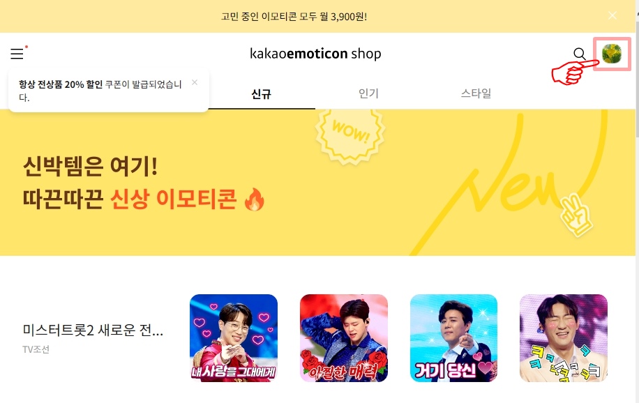 로그인이 완료가 되면 나의 카톡 프로필과 같은 사진이 아래와 같이 나옵니다~ 이제 이모티콘 메뉴 중 신규!!! 를 클릭합니다.
