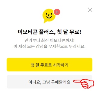 구매하기를 클릭하면 다음과 같은 메시지가 추가로 뜹니다. 월 3,900원으로 무제한 사용을 첫 달 무료로 시작하기 혹은 그냥 미스터트롯2 새로운 전설의 시작 이모티콘만 그냥 구매할래요~^^ 원하시는 걸로 선택하시면 됩니다. 그냥 구매할래요 클릭해 보았습니다.
