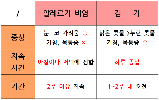 알레르기 비염과 헷갈리기 쉬운 것이 감기죠? 감기와 다른 점이 어떤 것인지 증상과 지속시간, 지속기간별로 비교해 보았습니다.