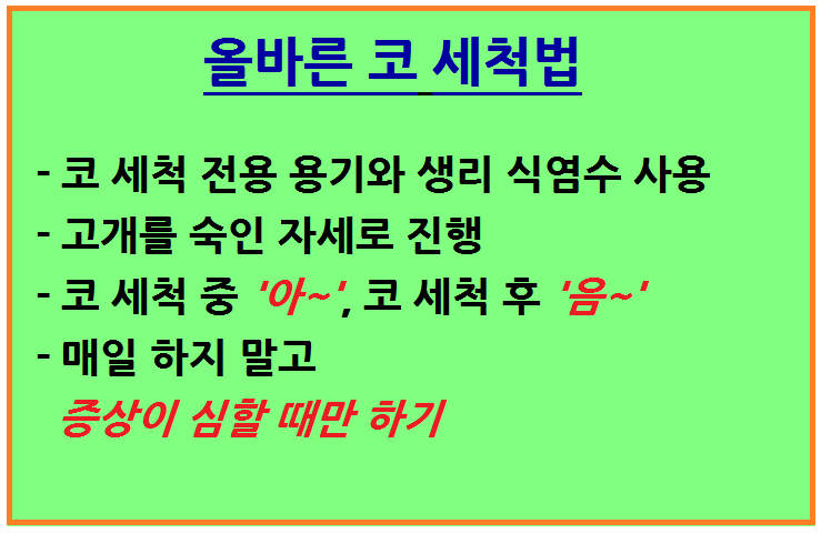 코 세척 중 아~~ 음~~ 소리를 내는 것은 생리 식염수가 입과 목으로 넘어가는 것을 방지해 주므로 꼭 해주면 좋습니다. 하지만 코세척도 너무 자주 하면 콧속을 건조하게 만들어 증상을 악화시킬 수 있으니 증상이 심할 때만 하는 것을 추천합니다.