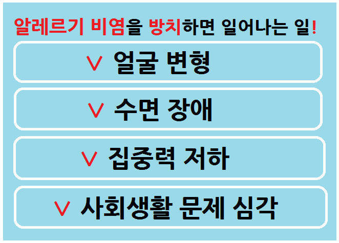 만성 비염의 경우 콧속 붓기로 인해 코막힘이 지속되고 구강호흡을 하게 됩니다. 구강호흡이 오랜 시간 지속되면 얼굴 폭이 좁아지고 구강이 돌출되는 형태로 변화를 일으키게 되어 얼굴의 변형이 일어납니다.