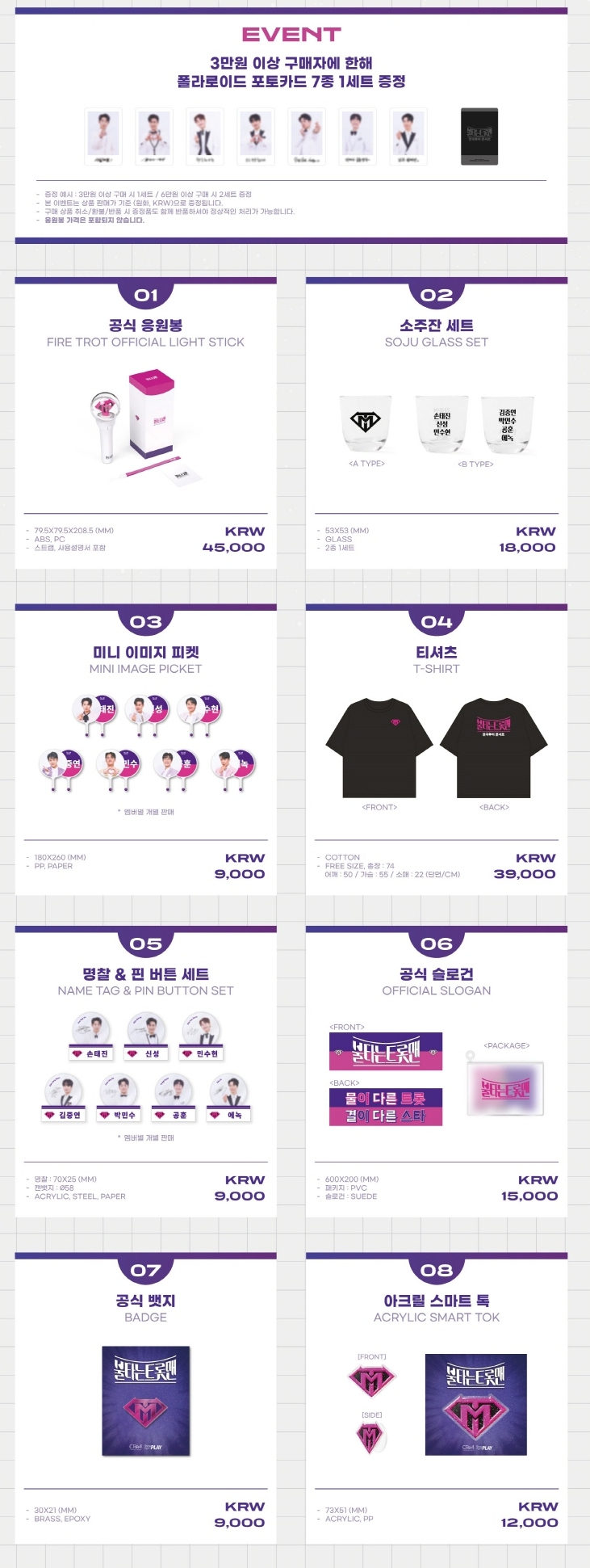 불타는 트롯맨 굿즈 3만 원 이상 구매자에 한해 폴라로이드 포토카드 7종 1세트 증정 이벤트도 있다고 합니다. 3만 원 이상 1세트, 6만 원 이상 2세트 증정하며 취소나 환불 등은 증정품과 함께 반품하셔야 하며 공식 응원봉은 포함되지 않는다고 합니다.