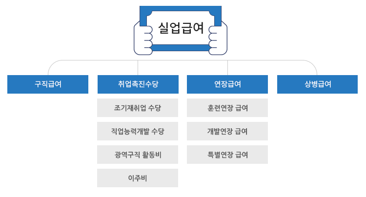 - 특별연장급여 : 실업급증 등으로 재취업이 어렵다고 인정되는 경우 고용노동부 장관이 일정 기간을 정하고 동기간 내 실업급여의 수급이 종료된 사람에게 지원