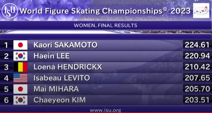 <2023년 피겨 세계선수권대회 여자 싱글 결과>