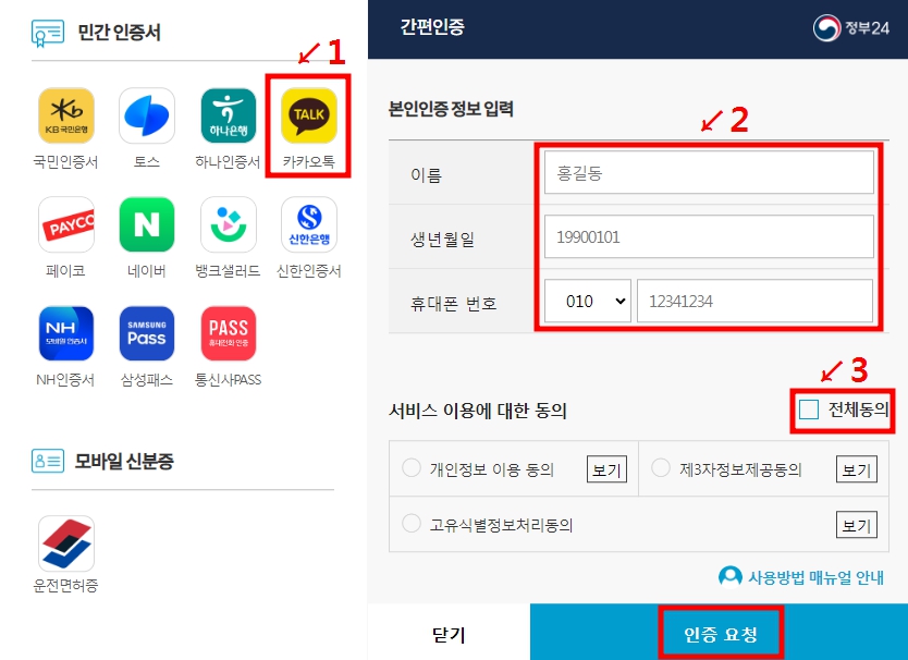 카카오톡 선택 후 본인인증 정보를 입력합니다. 서비스 이용에 대한 전체동의를 선택 후 인증 요청을 하면 카카오톡으로 인증 요청 안내 톡이 발송됩니다. 단계별 인증을 완료하면 정부24에 편리하게 로그인하실 수 있습니다.