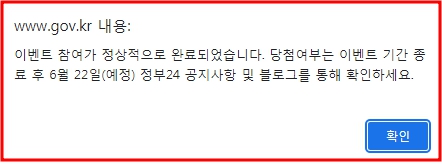 모든 단계가 완료되면 아래와 같은 이벤트 참여 완료 창이 뜹니다.