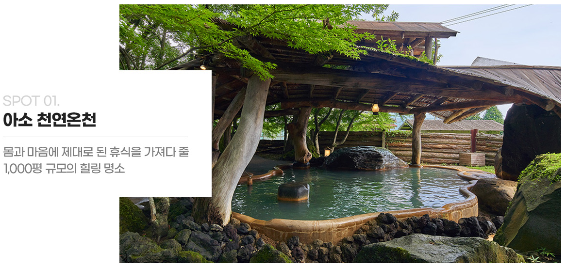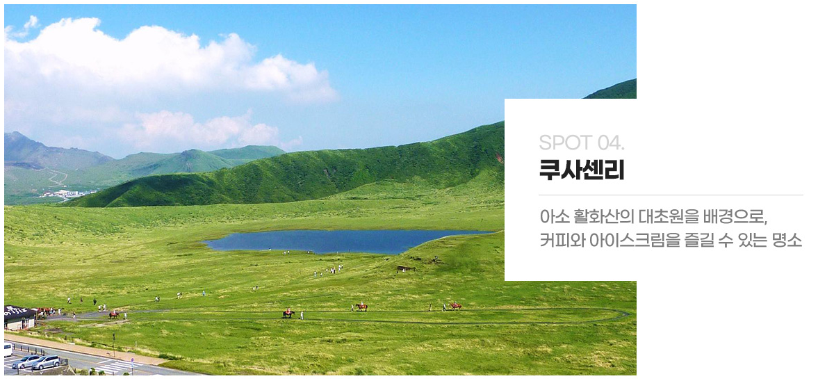 - 아소 : 관광과 체험, 온천이 가능한 곳, 아소산 대관봉(아소 밀크팩토리, 아소 로즈 가든, 미나미 아소 철도 열차, 돈도코유 히가에리 온천 체험)