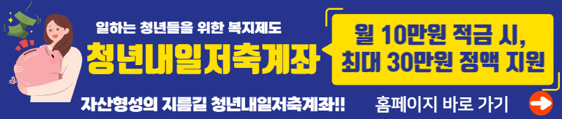청년내일저축계좌는 일을 하고 있는 청년이라면 누구나 신청할 수 있고 매달 10만 원을 저축하면 정부로부터 지원금을 최대 30만 원까지 받아 자산을 만들 수 있는 정부지원사업입니다.