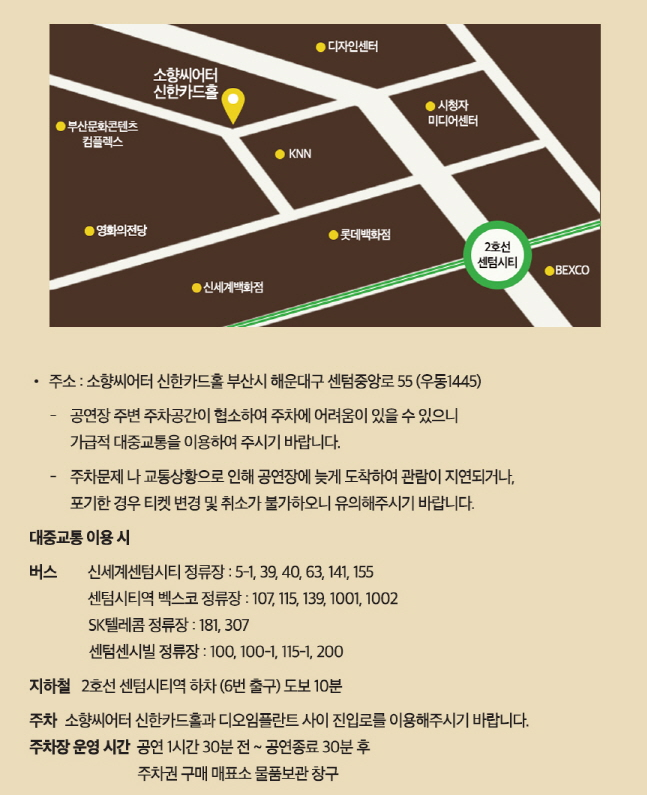 당일 공연장 주변이 매우 혼잡할 수 있으니 가급적 대중교통을 이용하시기 바랍니다.