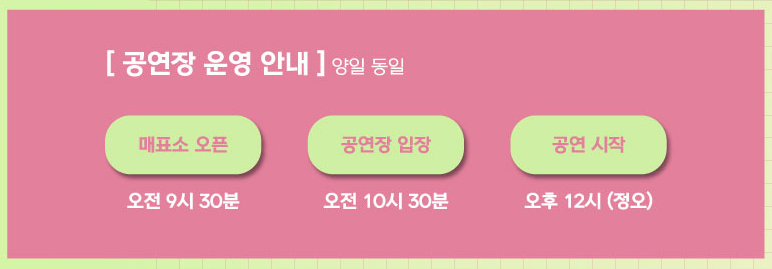 ▶ 예매가능시간 : 화~토요일 관람 시 전일 17시, 일~월요일 관람 시 토요일 오전 11시까지