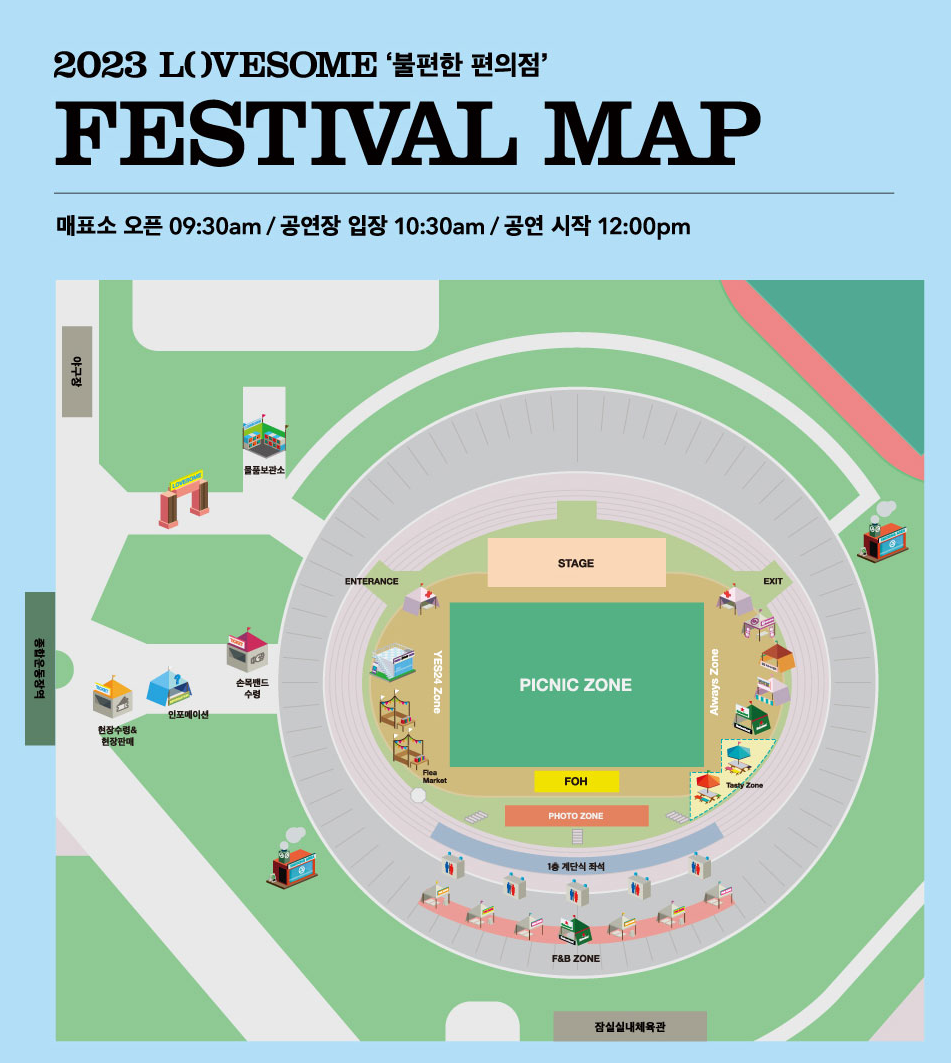 2023 LOVESOME-불편한 편의점 페스티벌이 2023년 4월 22일~4월 23일 이틀간 잠실종합운동장에서 개최됩니다. 현재 페스티벌 시작 임박과 함께 티켓 매진 임박 전입니다 매진 전 아래 링크로 편하게 예매 성공하시기 바랍니다.
