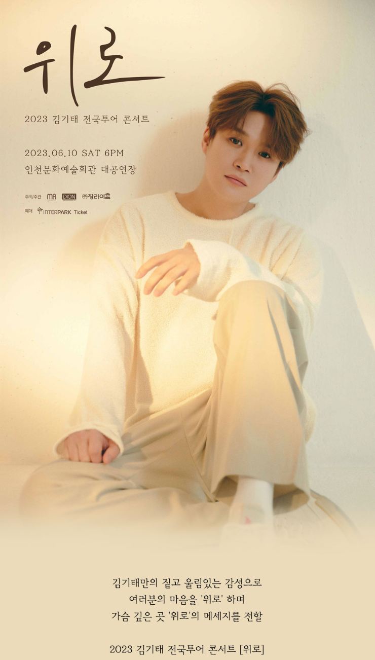 2023 김기태 전국투어 인천콘서트 [위로]가 6월 10일 단 1회 공연이 있습니다. 김기태만의 짙고 울림 있는 감성과 목소리로 '위로' 받으시고 감동받으실 수 있도록 아래 링크↓↓로 편리하게 예매하시기 바랍니다.