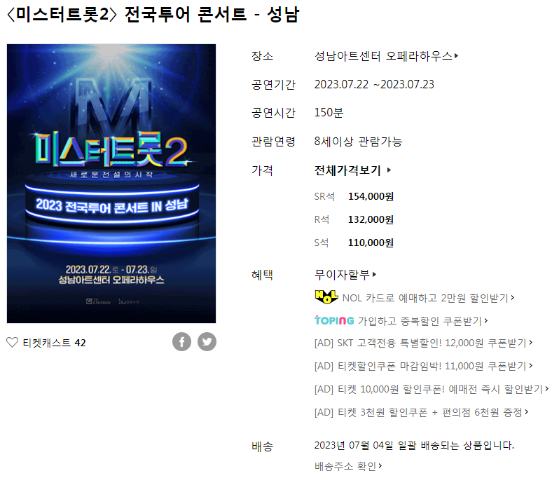 | 미스터트롯2 전국투어 『서울콘서트』 공연장 정보 및 일정 예매 방법 (1) | 2023.03.27 |